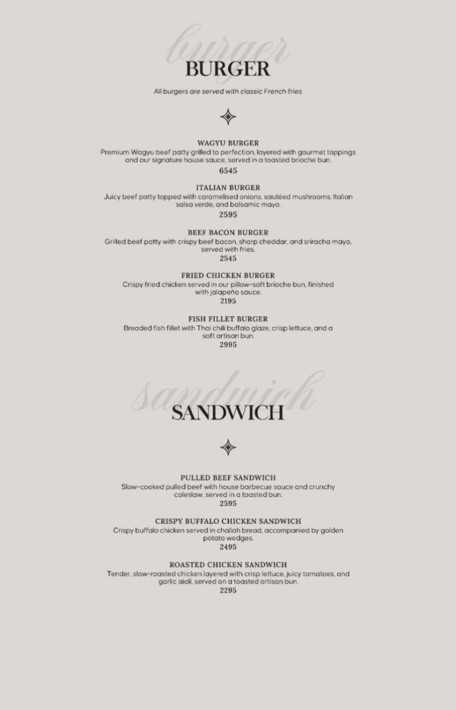 🍔 Burgers (Served with French Fries) Item Price (Rs.) Wagyu Burger 6,545 Italian Burger 2,595 Beef Bacon Burger 2,545 Fried Chicken Burger 2,195 Fish Fillet Burger 2,995