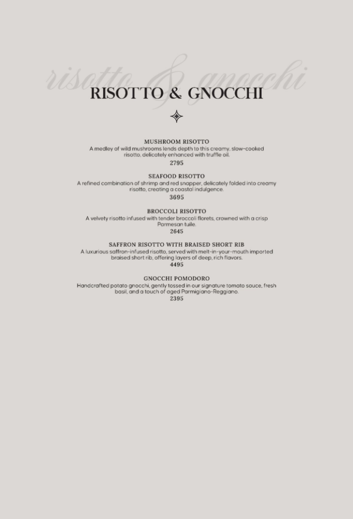 🍚 Risotto & Gnocchi Item Price (Rs.) Mushroom Risotto 2,795 Seafood Risotto 3,695 Broccoli Risotto 2,645 Saffron Risotto with Short Rib 4,495 Gnocchi Pomodoro 2,395