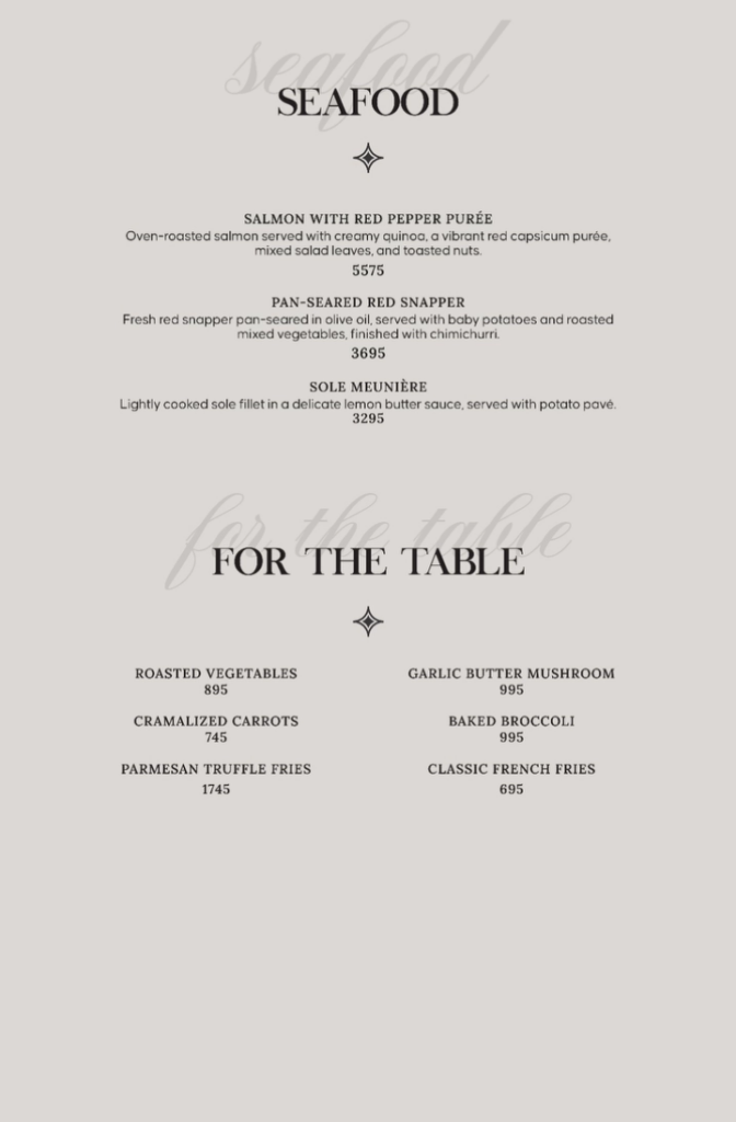 🐟 Seafood Item Price (Rs.) Salmon with Red Pepper Purée 5,575 Pan-Seared Red Snapper 3,695 Sole Meunière 3,295