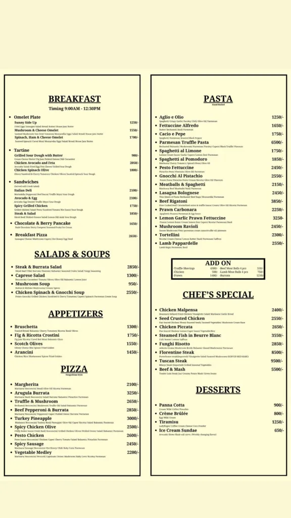 Cafe Funghi is a popular European-style café and restaurant located in Shaheen Market, Street 14, E-7, Islamabad. It is known for serving a wide variety of Italian and European-inspired dishes, including handcrafted pasta, wood-fired pizzas, gourmet breakfasts, salads, and artisan coffee, all in a cozy yet elegant setting. Over the years, it has become one of Islamabad’s favorite cafés, attracting food lovers, families, tourists, and professionals looking for a premium dining experience with high-quality flavors.