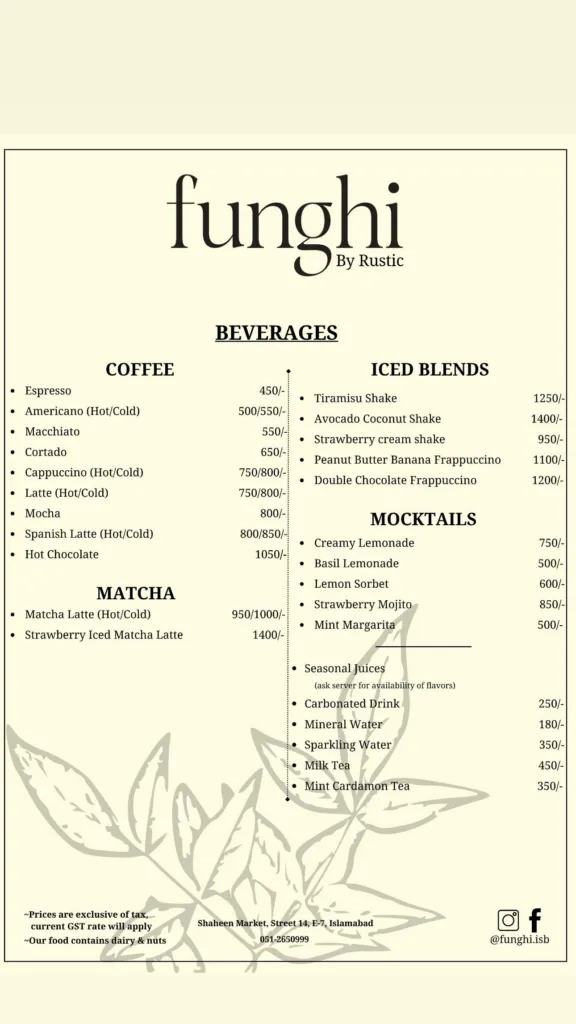 Cafe Funghi is located in the upscale Shaheen Market area of E-7, one of Islamabad’s most visited dining spots. The area is surrounded by other premium cafés, restaurants, and shops, making it a convenient and popular destination for both locals and visitors.