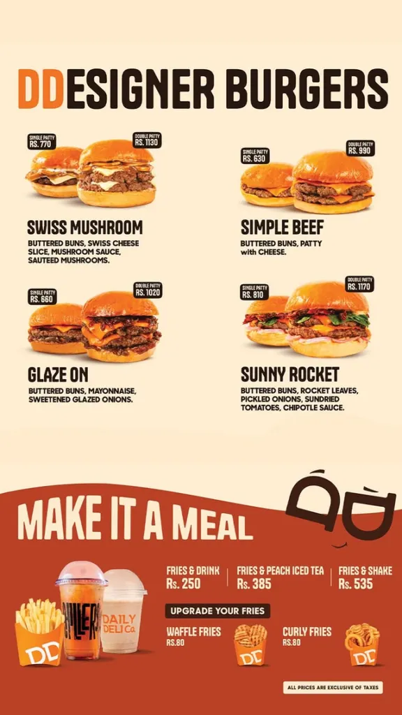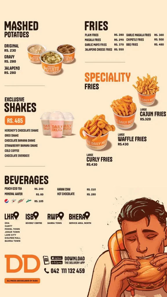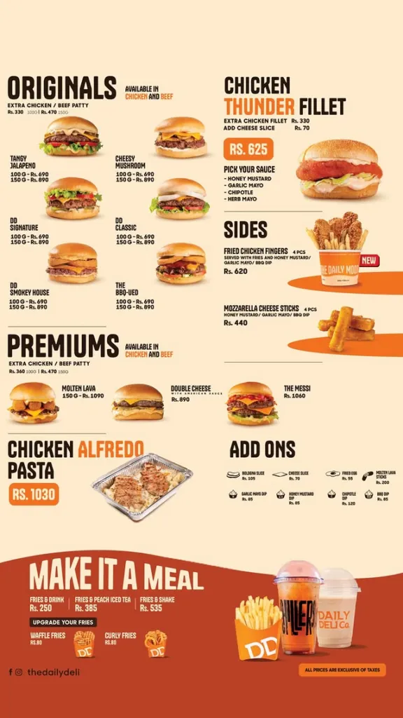 Daily Deli Co Islamabad is a premium burger and fast-food brand, well known for its designer beef burgers, premium chicken fillets, creamy pasta, crispy appetizers, shakes, and late-night service. With branches in Blue Area (F-6) and Bahria Town Phase 7, Daily Deli Co is a top choice for burger lovers in Islamabad & Rawalpindi, especially for late-night dining till 3 AM.