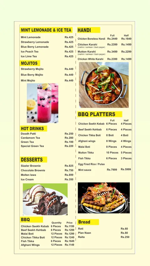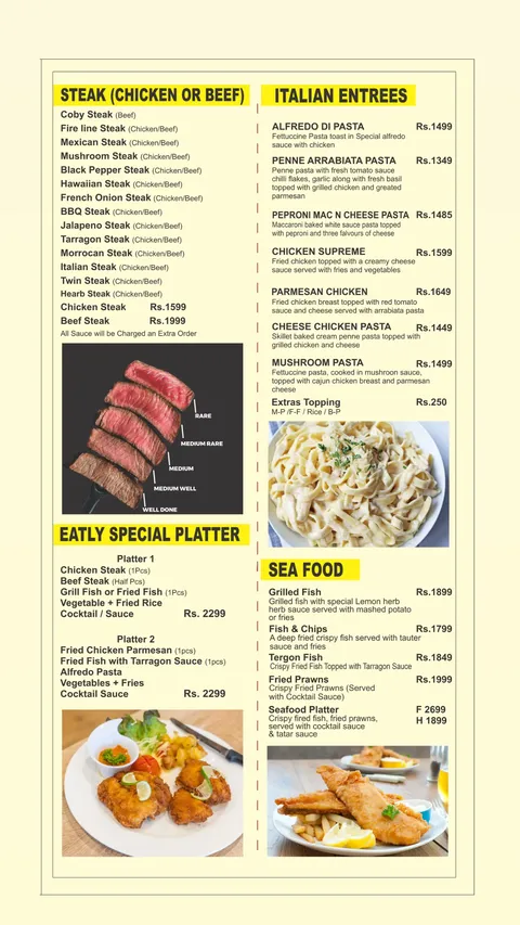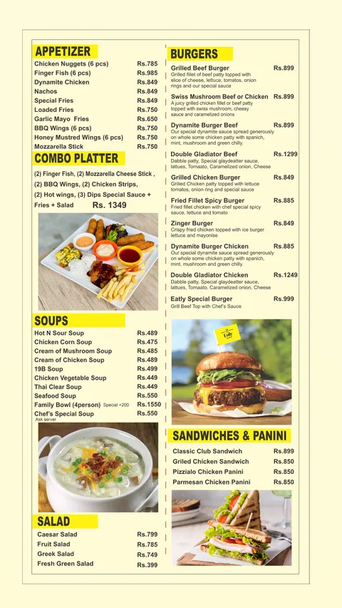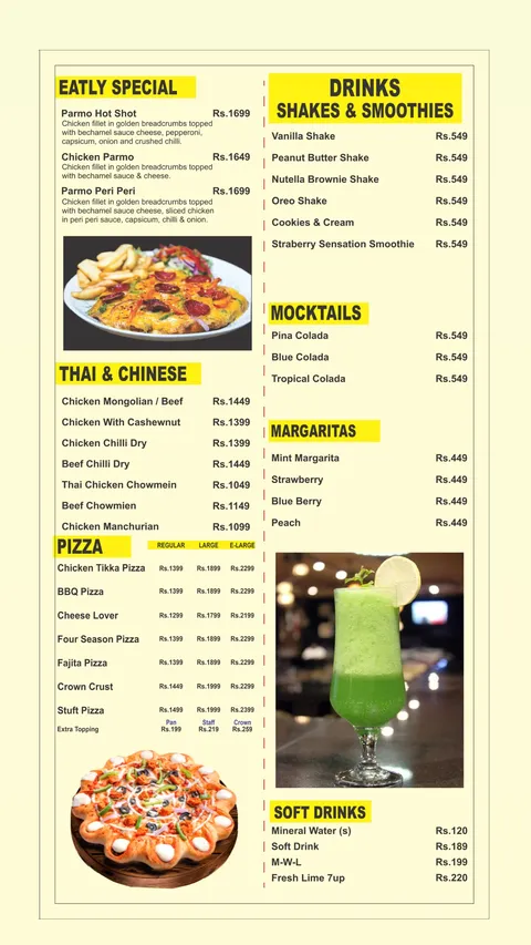 Eatly Rooftop Restaurant offers a complete dining experience in Islamabad with a vast menu that covers appetizers, burgers, steaks, Italian, seafood, Thai & Chinese, BBQ, handi & karahi, pizza, desserts, shakes, mocktails, and hot & cold beverages. Its rooftop location provides a relaxing ambiance with outdoor seating options, while the food quality and portion sizes ensure a satisfying meal for families, friends, and groups. From combo platters and BBQ specialties to premium steaks and seafood, Eatly delivers diverse flavors, making it one of the top dining choices in Islamabad for casual and fine dining alike.
