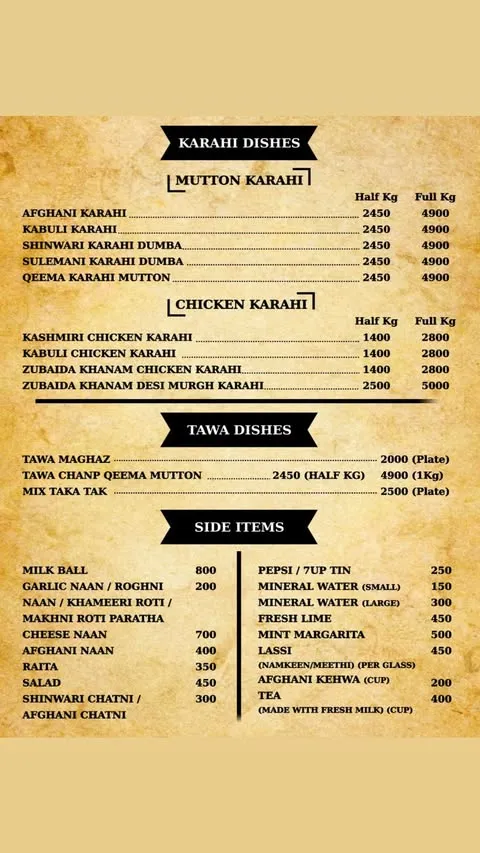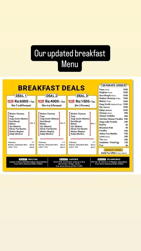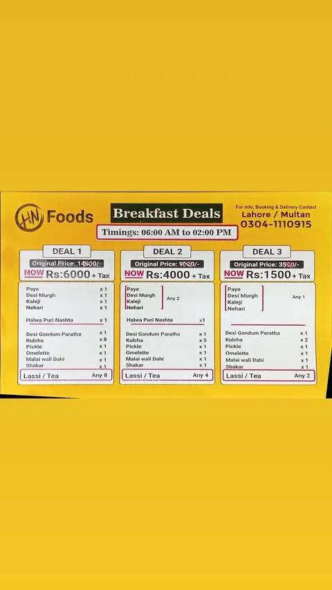 HN Foods Islamabad is a well-known restaurant that specializes in traditional Pakistani and Afghani-style meat dishes. The restaurant has gained popularity for its rich flavors and high-quality meat preparations, especially items like Multani Mutton Chanp, Khadda Sajji, Rangha Gosht, and classic karahi dishes. With its focus on authentic taste and hearty portions, HN Foods attracts food lovers who enjoy traditional desi cuisine. The menu also includes a variety of BBQ items, pulao platters, tandoor breads, and refreshing beverages, making it a great place for family meals and group dining. Below you can explore the complete HN Foods Islamabad menu organized by categories for easy browsing.