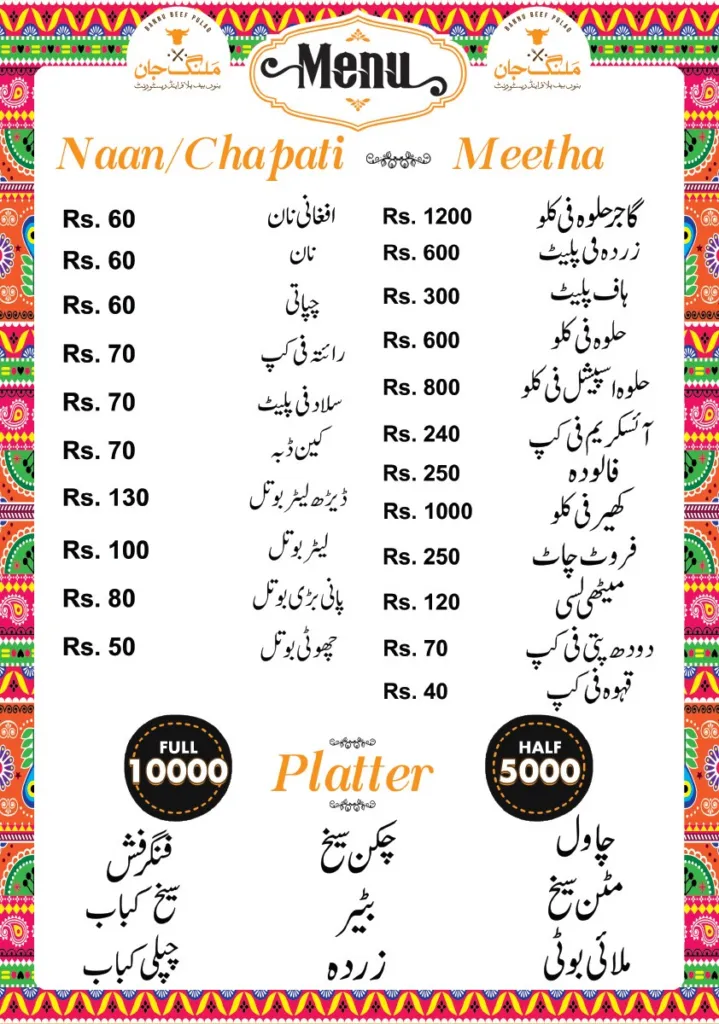 Malang Jan is a very popular restaurant. It is the best place to visit if you love eating lots of meat. They are famous for a special rice dish called Bannu Beef Pulao. Everything is cooked in a traditional way, and they even use Desi Ghee (pure butter) for some dishes to make them taste like home.