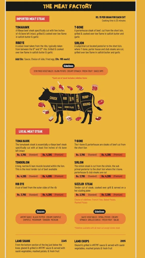 Rumba: The Meat Factory is a special place in Lahore for people who love meat. It is famous because they let you choose exactly how much meat you want to eat by weight (Grams).