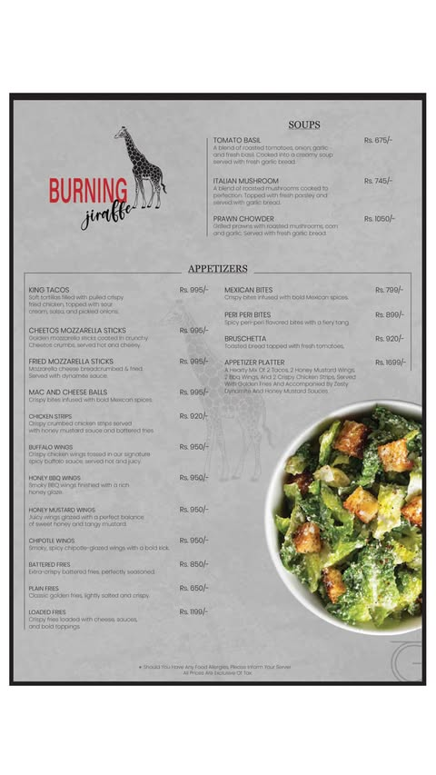 π APPETIZERS Item Price King Tacos Rs. 995/- Cheetos Mozzarella Sticks Rs. 995/- Fried Mozzarella Sticks Rs. 995/- Mac and Cheese Balls Rs. 995/- Chicken Strips Rs. 920/- Buffalo Wings Rs. 950/- Honey BBQ Wings Rs. 950/- Honey Mustard Wings Rs. 950/- Chipotle Wings Rs. 950/- Battered Fries Rs. 850/- Plain Fries Rs. 650/- Loaded Fries Rs. 1199/- Mexican Bites Rs. 799/- Peri Peri Bites Rs. 899/- Bruschetta Rs. 920/- Appetizer Platter Rs. 1699/-