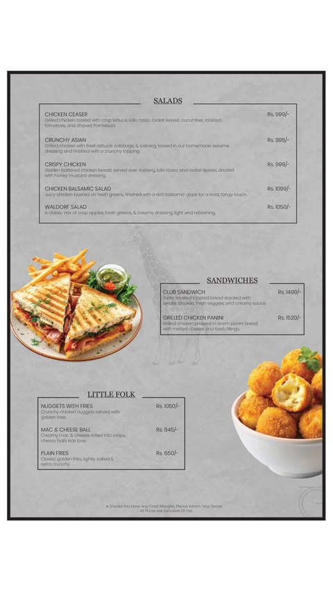 π₯ͺ SANDWICHES Item Price Club Sandwich Rs. 1499/- Grilled Chicken Panini Rs. 1520/-