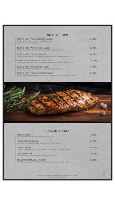 π GRILLED CHICKEN Item Price Texas Chicken Rs. 1895/- Honey Garlic Chicken Rs. 1895/- Italian Chicken Rs. 1895/- Chicken Ala Kiev Rs. 1895/- Grilled Mediterranean Chicken Rs. 1895/-