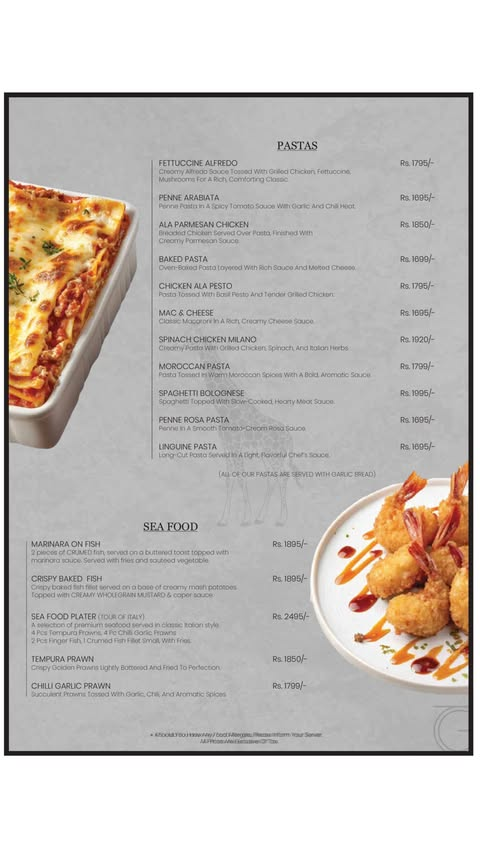 π PASTAS Item Price Fettuccine Alfredo Rs. 1795/- Penne Arabiata Rs. 1695/- Ala Parmesan Chicken Rs. 1850/- Baked Pasta Rs. 1699/- Chicken Ala Pesto Rs. 1795/- Mac & Cheese Rs. 1695/- Spinach Chicken Milano Rs. 1920/- Moroccan Pasta Rs. 1790/- Spaghetti Bolognese Rs. 1995/- Penne Rosa Pasta Rs. 1695/- Linguine Pasta Rs. 1695/