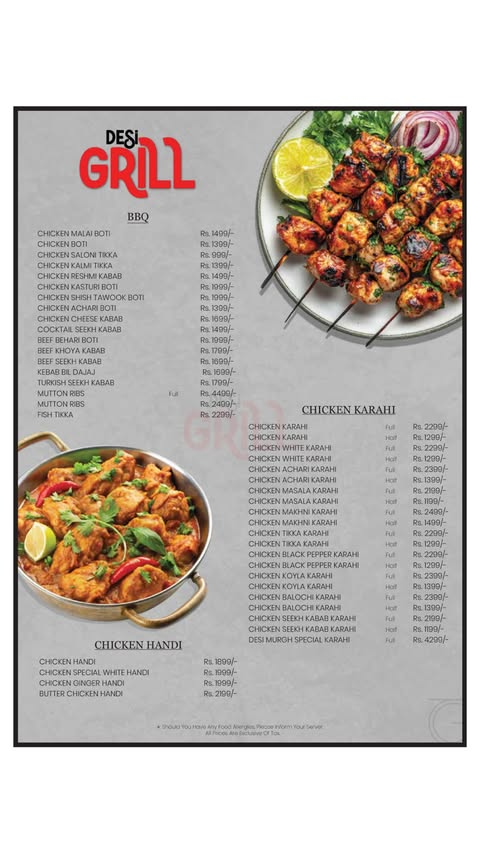 π₯ DESI BBQ Item Price Chicken Malai Boti Rs. 1499/- Chicken Boti Rs. 1399/- Chicken Saloni Tikka Rs. 999/- Chicken Kalmi Tikka Rs. 1399/- Chicken Reshmi Kabab Rs. 1499/- Chicken Kasturi Boti Rs. 1999/- Chicken Shish Tawook Boti Rs. 1999/- Chicken Achari Boti Rs. 1399/- Chicken Cheese Kabab Rs. 1699/- Cocktail Seekh Kabab Rs. 1499/- Beef Behari Boti Rs. 1000/- Beef Khoya Kabab Rs. 1799/- Beef Seekh Kabab Rs. 1609/- Kebab Be Dajaj Rs. 1699/- Turkish Seekh Kabab Rs. 1799/- Mutton Ribs Rs. 4499/- Mutton Ribs Rs. 2499/- Fish Tikka Rs. 2299/-