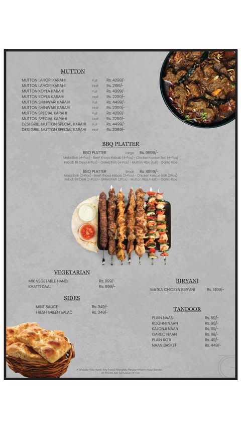 π MUTTON KARAHI Item Full Half Mutton Lahori Karahi Rs. 4299/- Rs. 2199/- Mutton Koyla Karahi Rs. 4399/- Rs. 2299/- Mutton Shinwari Karahi Rs. 4499/- Rs. 2399/- Mutton Special Karahi Rs. 4299/- Rs. 2299/- Desi Grill Mutton Special Karahi Rs. 4499/- Rs. 2399/-