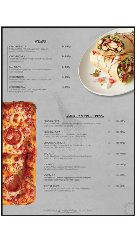 π AMERICAN CRUST PIZZA (10 inches) Item Price Chicken Tikka Rs. 1975/- Chicken Fajita Rs. 1975/- Chicken Pepperoni Rs. 1975/- BBQ Pizza Rs. 1975/- Malai Boti Rs. 1975/- Vegetable Rs. 1699/- Spicy Chicken Rs. 1699/-