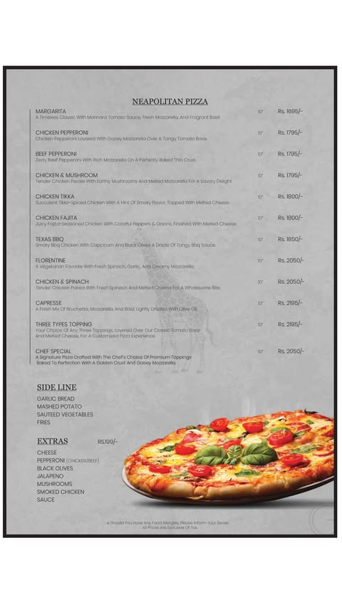 π NEAPOLITAN PIZZAS (10β) Item Description Price Margherita Marinara tomato sauce, fresh mozzarella & basil Rs. 1695 Chicken Pepperoni Chicken pepperoni with mozzarella on tomato base Rs. 1795 Beef Pepperoni Beef pepperoni with mozzarella on thin crust Rs. 1795 Chicken & Mushroom Chicken, mushrooms & mozzarella Rs. 1795 Chicken Tikka Tikka chicken with smoky flavor & cheese Rs. 1800 Chicken Fajita Chicken, capsicum, onions & cheese Rs. 1800 Texas BBQ BBQ chicken, capsicum, black olives & BBQ drizzle Rs. 1850 Florentine Spinach, garlic & creamy mozzarella Rs. 2050 Chicken & Spinach Chicken, spinach & cheese Rs. 2050 Caprese Bruschetta mix, mozzarella & basil Rs. 2195 Three Toppings Any 3 toppings of your choice Rs. 2195 Chef Special Chefβs premium toppings with mozzarella Rs. 2050