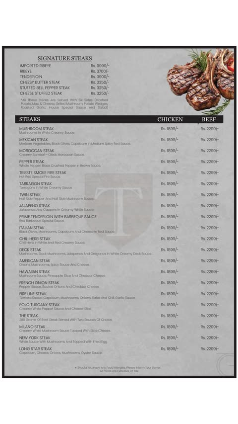 π₯© STEAKS (Chicken / Beef) Item Chicken Beef Mushroom Steak Rs. 1899 Rs. 2299 Mexican Steak Rs. 1899 Rs. 2299 Moroccan Steak Rs. 1899 Rs. 2299 Pepper Steak Rs. 1899 Rs. 2299 Smoke Fire Steak Rs. 1899 Rs. 2299 Tarragon Steak Rs. 1899 Rs. 2299 Twin Steak Rs. 1899 Rs. 2299 Jalapeno Steak Rs. 1899 Rs. 2299 Prime Tenderloin BBQ Rs. 1899 Rs. 2299 Italian Steak Rs. 1899 Rs. 2299 Chili Herb Steak Rs. 1899 Rs. 2299 Deck Steak Rs. 1899 Rs. 2299 American Steak Rs. 1899 Rs. 2299 Hawaiian Steak Rs. 1899 Rs. 2299 French Onion Steak Rs. 1899 Rs. 2299 Fire Line Steak Rs. 1800 Rs. 2299 Polo Tuscany Steak Rs. 1899 Rs. 2299 Milano Steak Rs. 1899 Rs. 2299 New York Steak Rs. 1899 Rs. 2299 Long Star Steak Rs. 1899 Rs. 2299