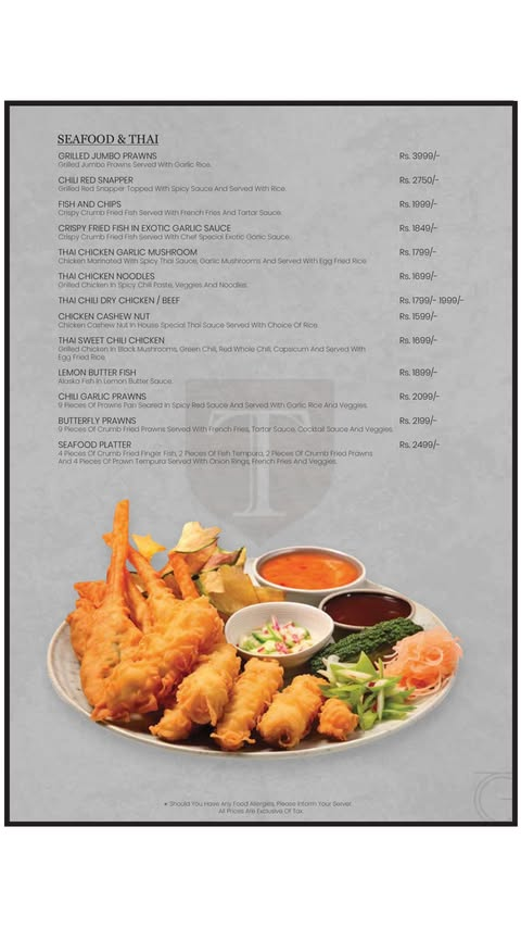 π€ SEAFOOD & THAI Item Price Grilled Jumbo Prawns Rs. 3999 Chili Red Snapper Rs. 2750 Fish & Chips Rs. 1999 Crispy Fried Fish (Garlic Sauce) Rs. 1849 Thai Chicken Garlic Mushroom Rs. 1799 Thai Chicken Noodles Rs. 1699 Thai Chili Dry (Chicken/Beef) Rs. 1799 / 1999 Chicken Cashew Nut Rs. 1599 Thai Sweet Chili Chicken Rs. 1699 Lemon Butter Fish Rs. 1899 Chili Garlic Prawns Rs. 2099 Butterfly Prawns Rs. 2199 Seafood Platter Rs. 2499