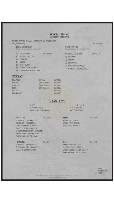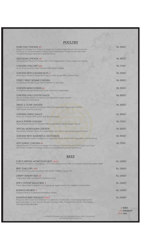 π₯© BEEF Item Description Price Chefβs Special Mongolian Beef Sweet glazed Mongolian beef Rs. 2490 Beef Chilli Dry Fried beef with green chilies Rs. 2490 Crispy Hendry Beef Crispy beef in special Chinatown sauce Rs. 2490 Spicy Oyster Sauce Beef Sliced beef in oyster sauce Rs. 2490 Mongolian Beef Traditional Mongolian style beef Rs. 2490 Shanghai Beef Noodles Slow-cooked tender beef with Shanghai noodles Rs. 2490