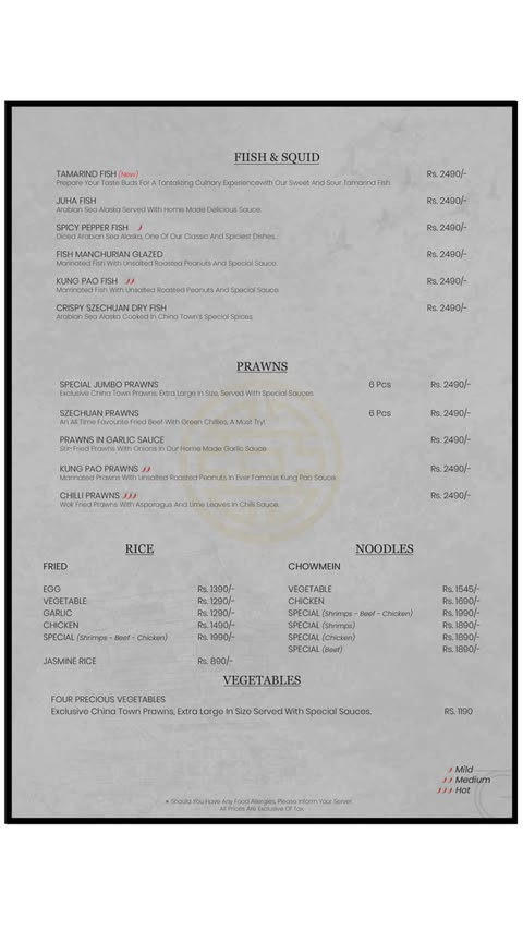 π€ PRAWNS Item Description Price Special Jumbo Prawns (6 pcs) Large prawns with special sauce Rs. 2490 Szechuan Prawns (6 pcs) Fried prawns in Szechuan sauce Rs. 2490 Prawns in Garlic Sauce Stir-fried prawns in garlic sauce Rs. 2490 Kung Pao Prawns Prawns with peanuts in Kung Pao sauce Rs. 2490 Chilli Prawns Wok-fried prawns in chili sauce Rs. 2490