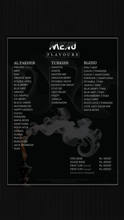 π¨ MENU FLAVOURS (Shisha) Single Flavor: Rs. 3000Glass Base: Rs. 4000Fruit Cap Small: Rs. 5000Fruit Cap Large: Rs. 6000