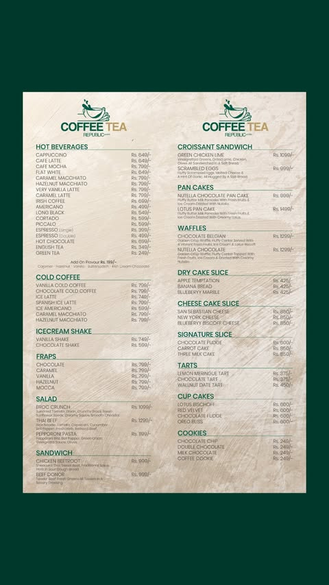 β HOT BEVERAGES Item Price Cappuccino Rs. 649 Cafe Latte Rs. 649 Cafe Mocha Rs. 799 Flat White Rs. 649 Caramel Macchiato Rs. 799 Hazelnut Macchiato Rs. 799 Americano Rs. 499 Espresso (Single) Rs. 309 Espresso (Double) Rs. 499 Hot Chocolate Rs. 699 English Tea Rs. 349 Green Tea Rs. 240