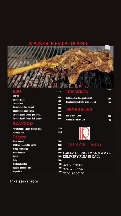 Kaiser Restaurant is a trusted name in Saddar, Karachi, offering classic Pakistani food with bold flavors, generous portions, and reasonable prices. From crowd-favorite karahi and BBQ to mutton specialties, biryani, and traditional desserts, the menu caters to a wide range of tastes. Its central location, long operating hours, and consistent quality make Kaiser Restaurant a reliable choice for everyday dining and family meals.