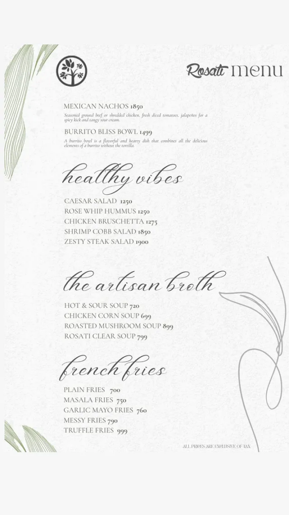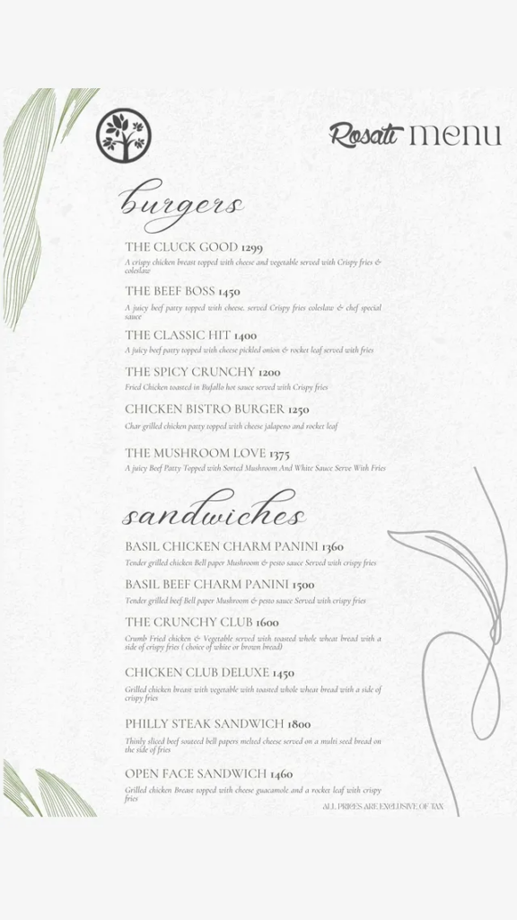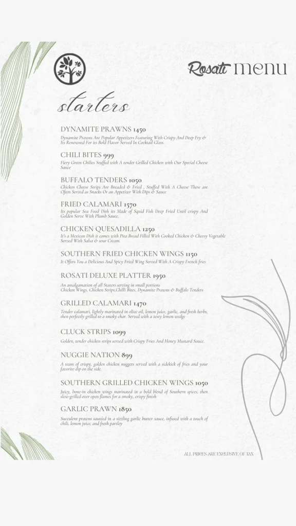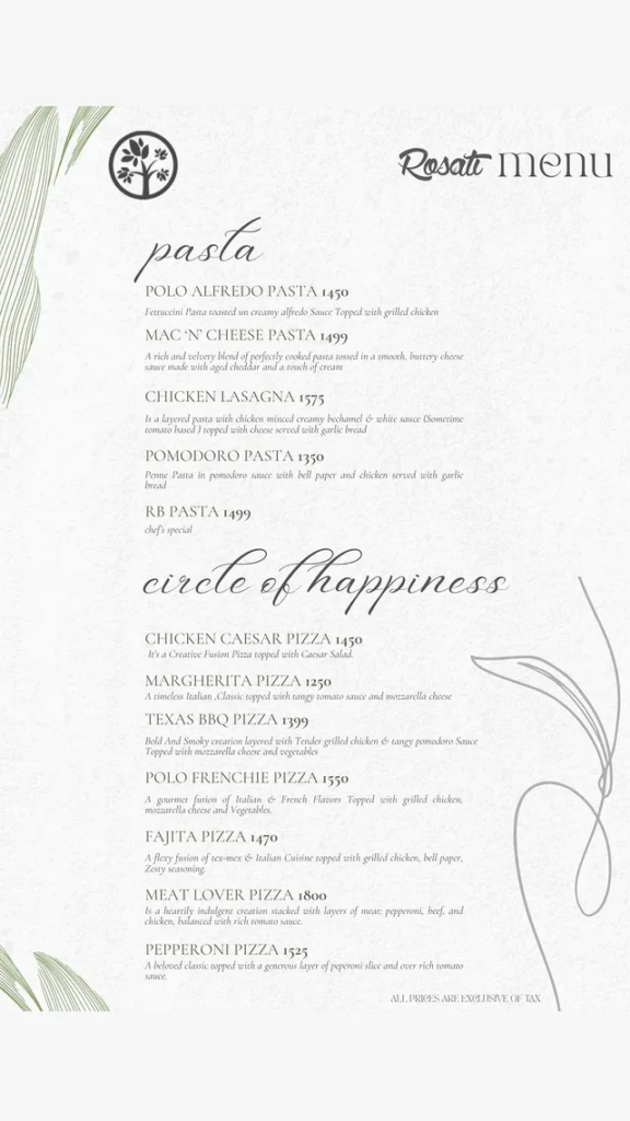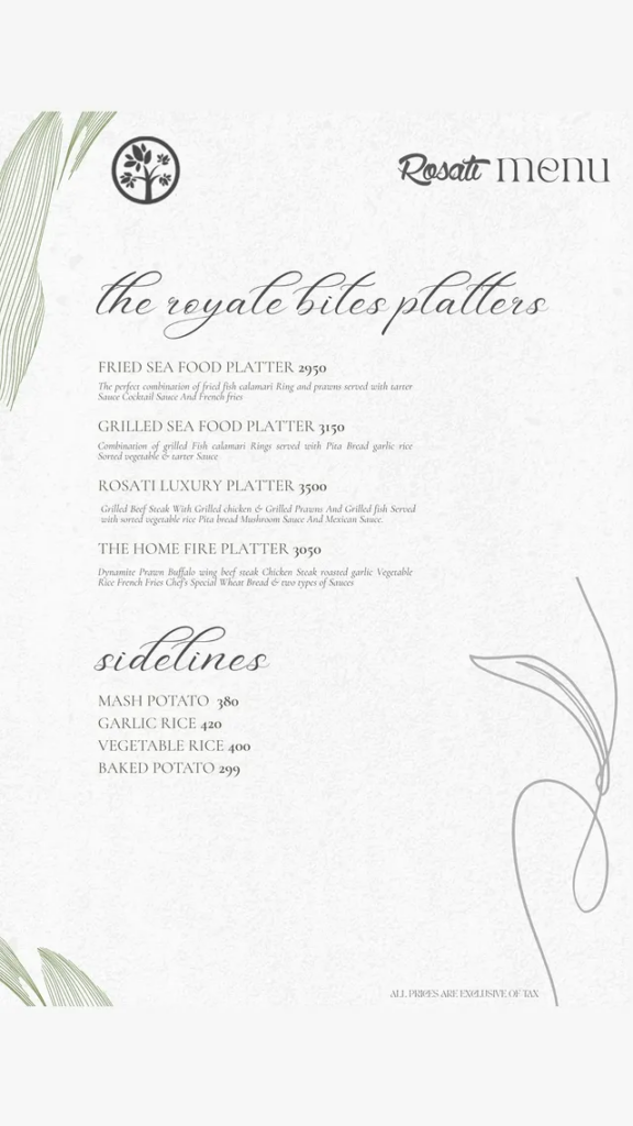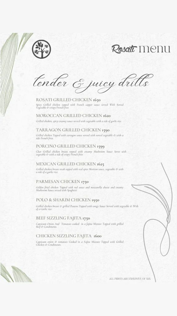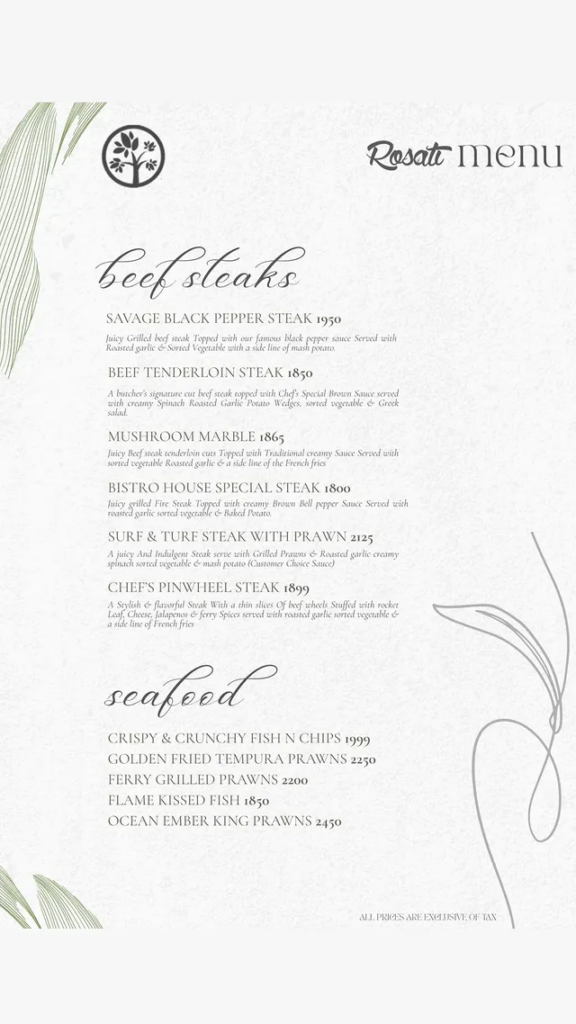 Rosati Bistro Karachi offers one of the most extensive and premium menus in the city, covering continental, Chinese, seafood, steaks, pizzas, pasta, platters, desserts, and handcrafted beverages. With late-night service till 3 AM, prime locations, elegant ambiance, and diverse food options, it is an ideal destination for family dinners, celebrations, business meetups, and late-night cravings.