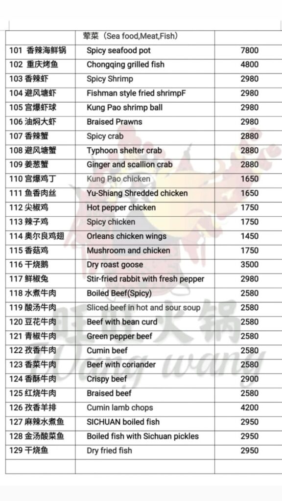 This section includes Wang Wang’s main Chinese specialties, featuring seafood, chicken, beef, lamb, and fish dishes with traditional Sichuan flavors.