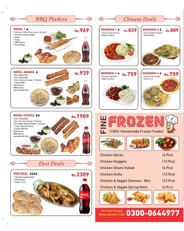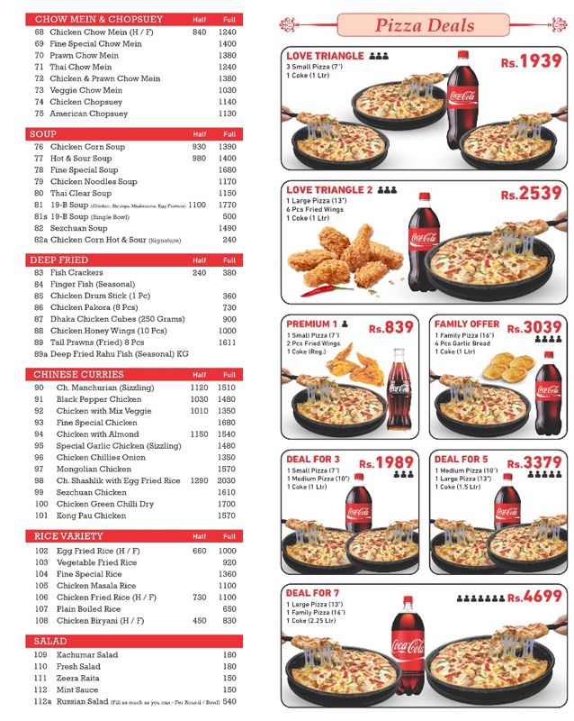 Pizza Name 7″ 10″ 13″ 16″ Description FP BBQ Special 960 1910 2790 3530 BBQ chicken, cheese, olives, veggies and special sauce Fine Special 700 1450 2140 2800 Roast chicken, tikka, sausages, veggies & cheese Mexican Stuffed 920 1830 2450 3080 Stuffed edges with chicken & cheese Veggie Lovers 620 1170 1880 2290 Tomato, peppers, olives, mushrooms & cheese Cheese Lovers 620 1170 1880 2290 Extra rich cheese base Chicken Fajita 650 1300 2030 2670 Chicken fajita with onions & peppers Chicken Tikka 650 1300 2030 2670 Tikka chicken with veggies & cheese Mexican Chilli 680 1380 2100 2740 Spicy Mexican chilli toppings Chicken Supreme 680 1380 2100 2740 Chicken, tomato, peppers & cheese Chef Special 680 1380 2100 2740 Olives, mushrooms, chicken & cheese Pepperoni Pizza 680 1300 2030 2670 Classic pepperoni with cheese Afghani Salateen 810 1660 2940 3540 Smoky chicken with corn & herbs FP Special Sooper Cheesy 720 1570 2460 3180 Extra cheesy pizza with toppings Peri Peri Chicken 720 1490 2180 2850 Peri peri spiced barbecue chicken Malai Tikka 720 1490 2180 2850 Creamy malai tikka chicken Hot Lover 680 1380 2100 2740 Hot and spicy lovers’ pizza Soft Hot 680 1380 2100 2740 Mild spicy combination King Crust 1550 3020 3820 – Thick crust pizza with premium toppings Italian Crust 640 1280 1960 2600 Thin Italian style crust Creamy Crust 720 1490 2180 2850 Cream cheese stuffed edges Extra Toppings 130 320 510 650 Choice of extra toppings Extra Cheese 130 320 510 650 Additional cheese topping