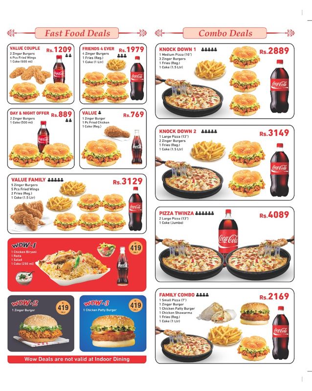 Love Triangle – 3 small pizzas + 1 CokeLove Triangle 2 – 1 large pizza + 6 pcs wings + CokePremium 1 – 1 small pizza + fries + CokeFamily Offer – 1 family pizza + garlic bread + CokeDeal for 3 / 5 / 7 – Multiple pizzas + wings + CokeDeals are priced for value and perfect for group occasions.