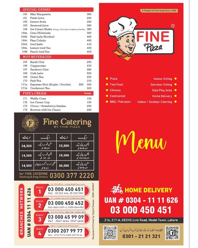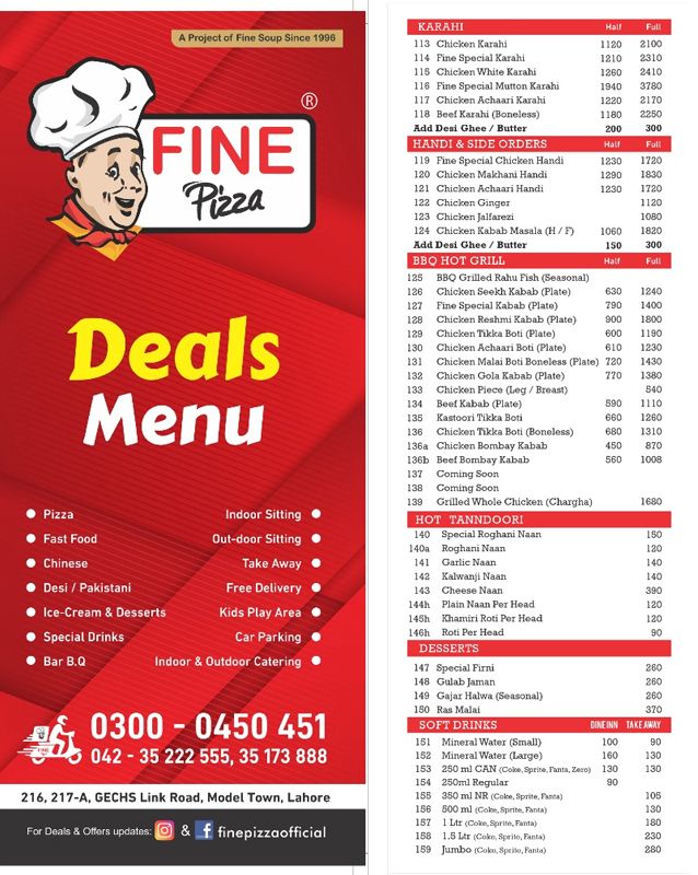 Final Thoughts Fine Pizza Lahore’s menu covers a huge range of pizzas, burgers, shawarmas, Chinese curries, rice dishes, salads, drinks, and desserts . With multiple size options and combo deals, it gives great flexibility for both individual diners and groups.
