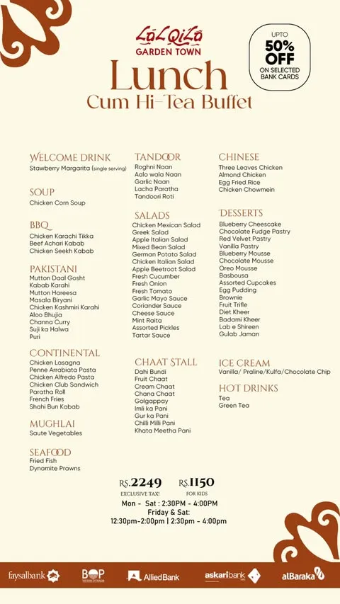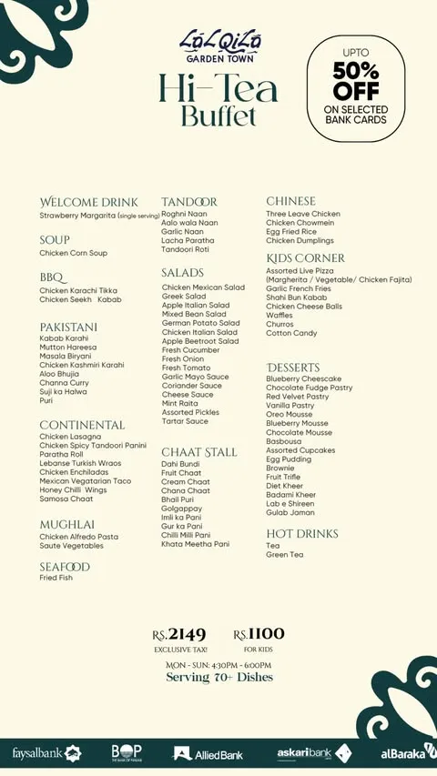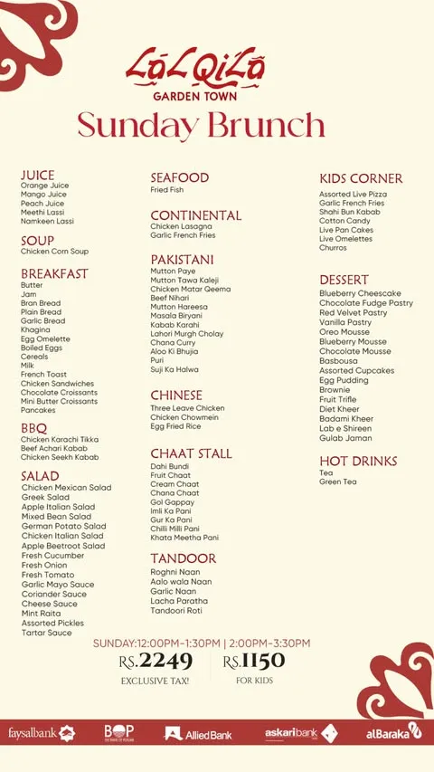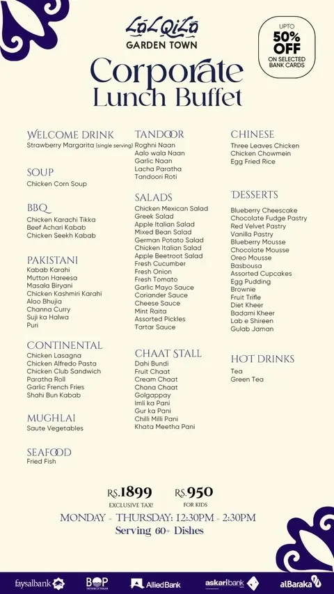 LalQila Restaurant is a well-known dining destination known for its rich flavors and traditional menu inspired by Mughlai and Pakistani cuisine. It is especially famous for its wide variety of dishes, including BBQ, karahi, handi, and classic desi specialties prepared using high-quality ingredients and authentic recipes. The restaurant offers a diverse selection that appeals to both casual diners and food enthusiasts looking for a complete and satisfying meal.