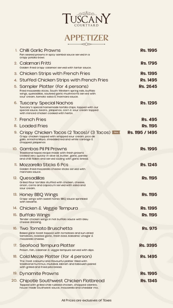 Appetizers Item Name Price (PKR) Chilli Garlic Prawns 1,995 Calamari Fritti 1,795 Chicken Strips with French Fries 1,395 Stuffed Chicken Strips with French Fries 1,495 Sampler Platter (for 4 persons) 2,645 Tuscany Special Nachos 1,295 French Fries 495 Loaded Fries 1,195 Crispy Chicken Tacos (2 Tacos / 3 Tacos) 1,195 / 1,495 Gambas Pil Pil Prawns 1,995 Mozzarella Sticks (6 Pcs) 1,245 Quesadillas 1,195 Honey BBQ Wings 1,195 Chicken & Veggie Tempura 1,395 Buffalo Wings 1,195 Two Tomato Bruschetta 975 Seafood Tempura Platter 3,395 Cold Mezze Platter (for 4 persons) 1,495 Dynamite Prawns 1,995 Chipotle Southwest Chicken Flatbread 1,345