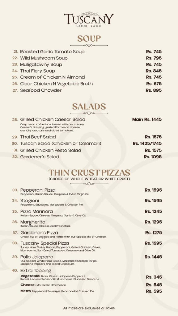 Thin Crust Pizzas Item Name Price (PKR) Pepperoni Pizza 1,595 Stagioni 1,595 Pizza Marinara 1,245 Margherita 1,295 Gardener’s Pizza 1,275 Tuscany Special Pizza 1,695 Pollo Jalapeno 1,445 Extra Toppings Extra Vegetables (Olives, Jalapenos, etc.) 345 Extra Cheese (Mozzarella, Parmesan) 545 Extra Meat (Pepperoni, Sausages, etc.) 595