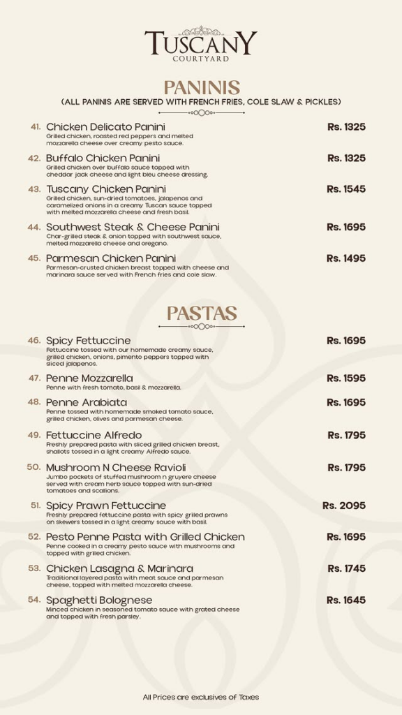 Paninis & Pastas Item Name Price (PKR) Paninis (With Fries & Slaw) Chicken Delicato Panini 1,325 Buffalo Chicken Panini 1,325 Tuscany Chicken Panini 1,545 Southwest Steak & Cheese Panini 1,695 Parmesan Chicken Panini 1,495 Pastas Spicy Fettuccine 1,695 Penne Mozzarella 1,595 Penne Arabiata 1,695 Fettuccine Alfredo 1,795 Mushroom N Cheese Ravioli 1,795 Spicy Prawn Fettuccine 2,095 Pesto Penne Pasta with Grilled Chicken 1,695 Chicken Lasagna & Marinara 1,745 Spaghetti Bolognese 1,645