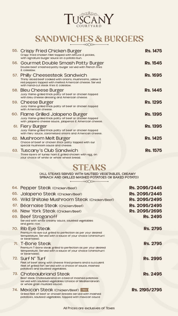 Sandwiches, Burgers & Steaks Item Name Price (PKR) Burgers & Sandwiches Crispy Fried Chicken Burger 1,475 Gourmet Double Smash Patty Burger 1,545 Philly Cheesesteak Sandwich 1,695 Bleu Cheese Burger 1,445 Cheese Burger 1,295 Flame Grilled Jalapeno Burger 1,395 Fiery Burger 1,395 Mushroom Melt Burger 1,425 Tuscany’s Club Sandwich 1,575 Steaks (Chicken / Beef) Pepper Steak 2,095 / 2,445 Jalapeno Steak 2,095 / 2,445 Wild Shiitake Mushroom Steak 2,095 / 2,495 Béarnaise Steak 2,095 / 2,495 New York Steak 2,095 / 2,695 Beef Stroganoff 2,495 Rib Eye Steak 2,795 T-Bone Steak 2,795 Surf N’ Turf 2,995 Chateaubriand Steak 2,495 Mexican Steak 2,195 / 2,795