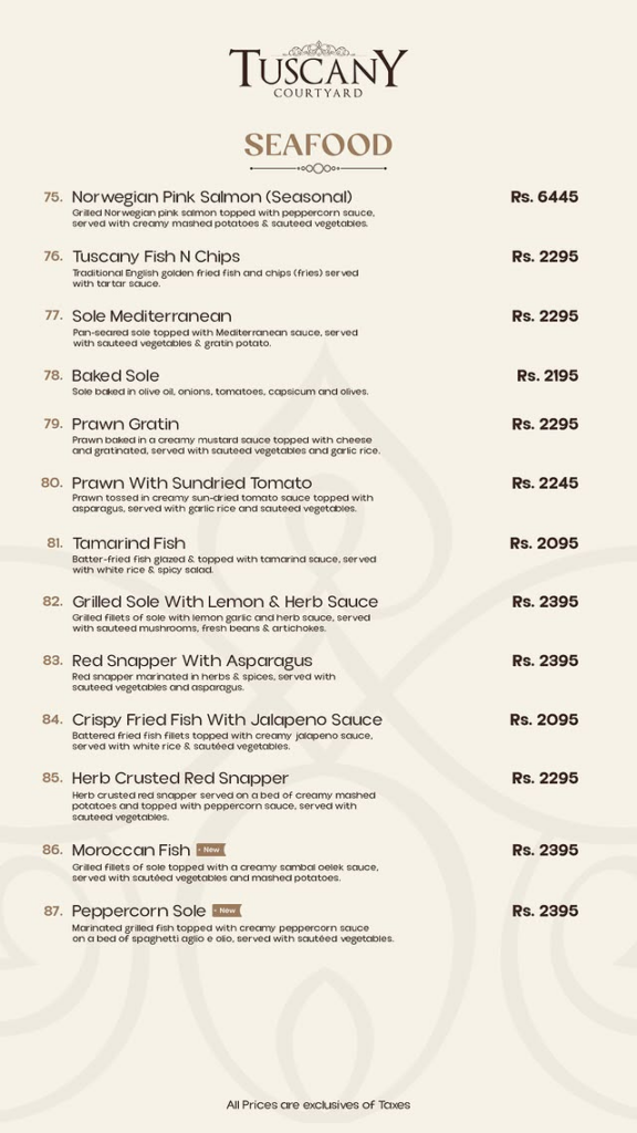 Seafood Item Name Price (PKR) Norwegian Pink Salmon (Seasonal) 6,445 Tuscany Fish N Chips 2,295 Sole Mediterranean 2,295 Baked Sole 2,195 Prawn Gratin 2,295 Prawn With Sundried Tomato 2,245 Tamarind Fish 2,095 Grilled Sole With Lemon & Herb Sauce 2,395 Red Snapper With Asparagus 2,395 Crispy Fried Fish With Jalapeno Sauce 2,095 Herb Crusted Red Snapper 2,295 Moroccan Fish 2,395 Peppercorn Sole 2,395