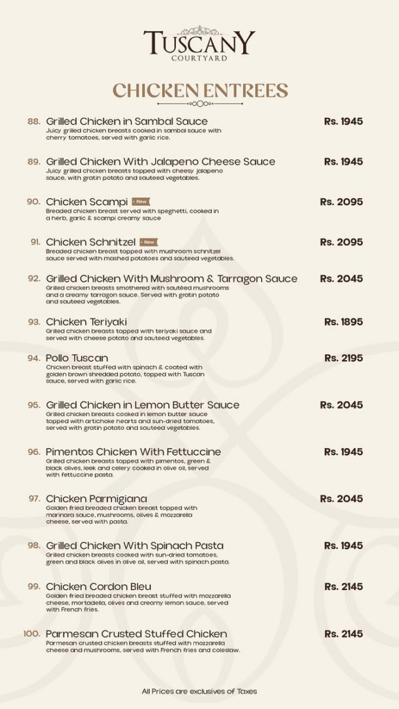 Chicken Entrees Item Name Price (PKR) Grilled Chicken in Sambal Sauce 1,945 Grilled Chicken With Jalapeno Cheese Sauce 1,945 Chicken Scampi 2,095 Chicken Schnitzel 2,095 Grilled Chicken With Mushroom & Tarragon 2,045 Chicken Teriyaki 1,895 Pollo Tuscan 2,195 Grilled Chicken in Lemon Butter Sauce 2,045 Pimentos Chicken With Fettuccine 1,945 Chicken Parmigiana 2,045 Grilled Chicken With Spinach Pasta 1,945 Chicken Cordon Bleu 2,145 Parmesan Crusted Stuffed Chicken 2,145