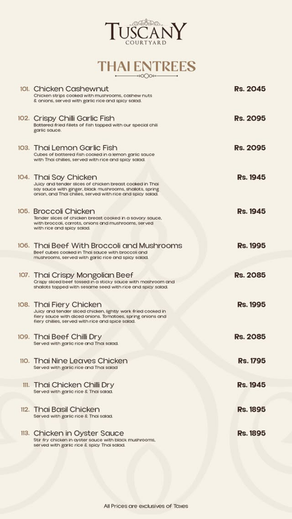 Thai Entrees Item Name Price (PKR) Chicken Cashewnut 2,045 Crispy Chilli Garlic Fish 2,095 Thai Lemon Garlic Fish 2,095 Thai Soy Chicken 1,945 Broccoli Chicken 1,945 Thai Beef With Broccoli and Mushrooms 1,995 Thai Crispy Mongolian Beef 2,085 Thai Fiery Chicken 1,995 Thai Beef Chilli Dry 2,085 Thai Nine Leaves Chicken 1,795 Thai Chicken Chilli Dry 1,945 Thai Basil Chicken 1,895 Chicken in Oyster Sauce 1,895