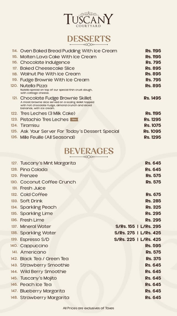 Desserts & Beverages Item Name Price (PKR) Desserts Oven Baked Bread Pudding 1,195 Molten Lava Cake 1,195 Chocolate Indulgence 795 Baked Cheesecake Slice 895 Walnut Pie With Ice Cream 895 Fudge Brownie With Ice Cream 795 Nutella Pizza 895 Chocolate Fudge Brownie Skillet 1,495 Tres Leches (3 Milk Cake) 1,195 Pistachio Tres Leches 1,295 Tiramisu 1,075 Mille Feuille (Seasonal) 1,295 Beverages Mint Margarita / Pina Colada 645 Frenzee / Coconut Coffee Crunch 575 Cold Coffee 675 Soft Drink 285 Sparkling Peach / Sparkling Lime 325 Mineral Water (Small / Large) 155 / 295 Sparkling Water (Small / Large) 275 / 425 Espresso / Cappuccino 225 / 595 Americano / Tea / Green Tea 375 Smoothie (Strawberry / Wild Berry) 645 Mojito / Peach Ice Tea 645 Margarita (Blueberry / Strawberry) 645