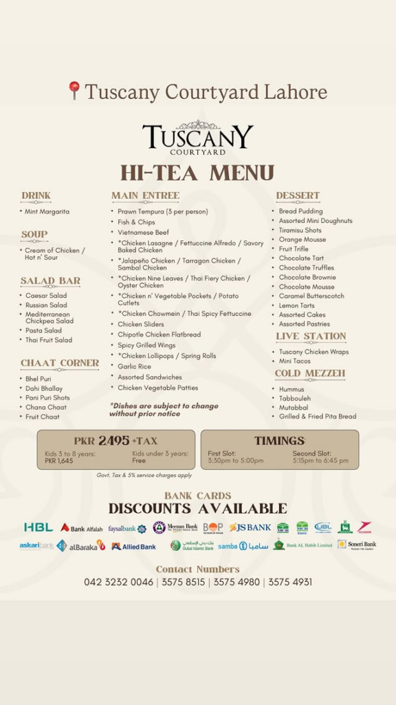 Tuscany Courtyard (Lahore) – Contact Details Detail Type Information Address 16-C-1, M.M. Alam Road, Gulberg III, Lahore, Pakistan Phone Numbers 042-32320046, 042-35758515, 042-35754980, 042-35754931 Hi-Tea Timings Slot 1: 3:30 PM to 5:00 PMSlot 2: 5:15 PM to 6:45 PMLunch Timings 12:00 PM to 3:00 PM (Monday to Friday) Popular Location M.M. Alam Road (Gulberg)