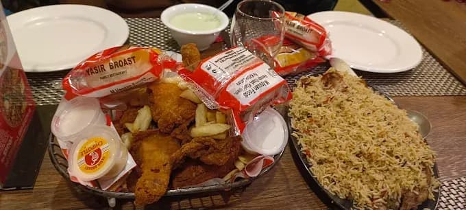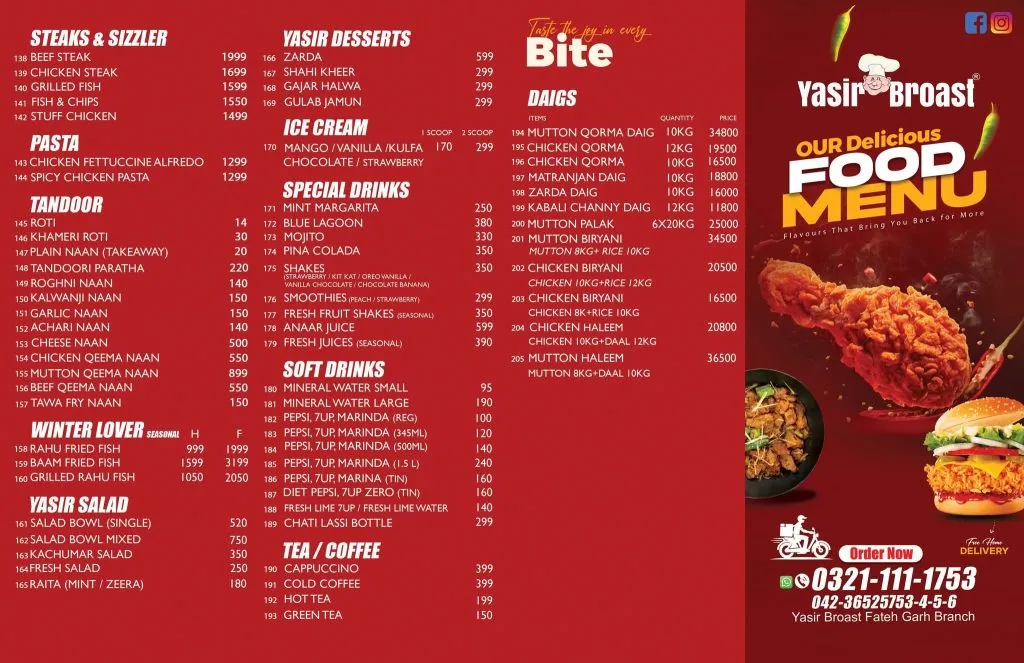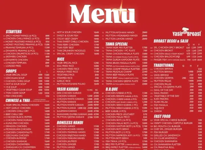 Yasir Broast is a well-known restaurant in Pakistan that offers a wide range of flavorful dishes for food lovers. The restaurant is especially popular for its crispy broast chicken, tasty BBQ items, and a variety of traditional and modern meals. Along with broast, the menu also includes Chinese dishes, seafood, handi specialties, soups, and delicious desserts, giving customers plenty of options to choose from.
