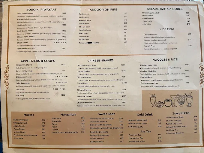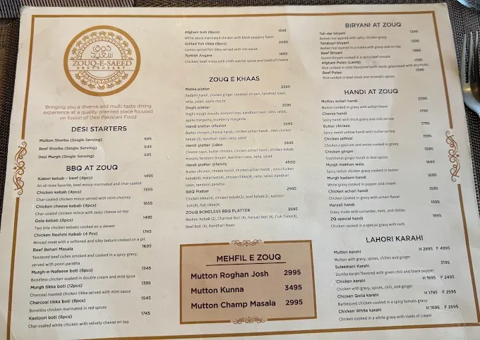 Zouq e Saeed Restaurant in Lahore offers a complete fine dining experience featuring traditional Pakistani cuisine, BBQ specialties, Chinese dishes, handi, karahi, biryani, platters, desserts, and beverages. Located in Gulberg III, the restaurant is known for its rich desi flavors, signature platters, and family-style dining. Below is the complete menu with all items and prices exactly as provided.