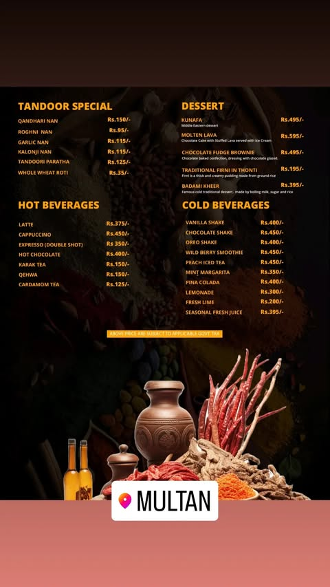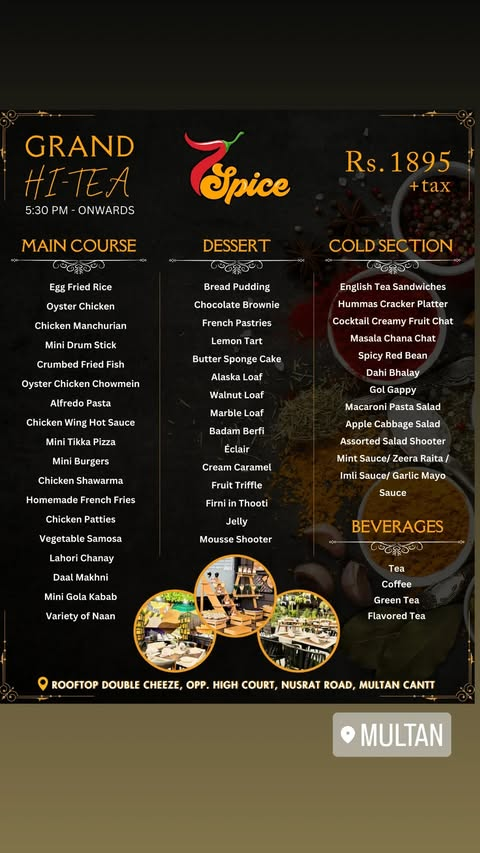 7 Spice Restaurant Multan offers a refined dining experience with a diverse menu that covers continental dishes, Afghani specialties, BBQ platters, Chinese cuisine, desserts, and an extensive Hi-Tea selection. Its elegant rooftop location and carefully curated recipes make it an ideal choice for family dinners, gatherings, and special occasions. From signature platters to premium desserts and refreshing beverages, 7 Spice delivers both quality and variety, making it one of the notable dining spots in Multan.