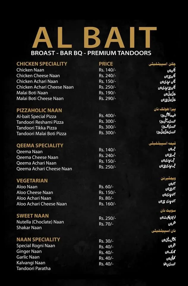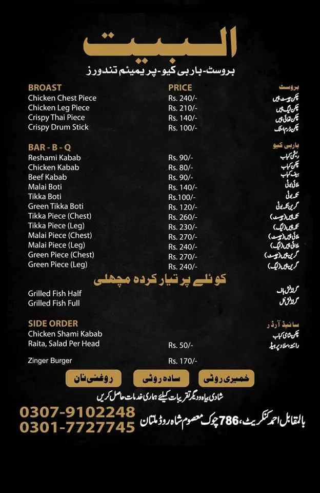 Al Bait Restaurant in Jan Muhammad Colony, Multan offers a variety of broast items, bar-b-q specialties, grilled fish, side orders, chicken naan variations, qeema naan options, vegetarian naans, sweet naans, and specialty tandoor items. With economical pricing and traditional flavors, the restaurant remains a convenient dining choice for residents around Bismillah Chowk. Operating daily from 12:30 PM to 1 AM, Al Bait Restaurant provides freshly prepared meals suitable for both casual dining and takeaway.