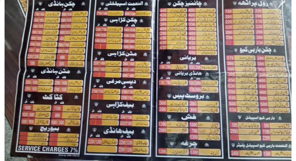 Al Nemat Restaurant and BBQ is a well-known dine-in restaurant located in Multan, Pakistan, offering an extensive and diverse menu that covers traditional BBQ, karahi, handi, Chinese cuisine, broast, burgers, sandwiches, rolls, shakes, juices, desserts, and special deals. With operating hours from 11:00 AM to 4:00 AM, the restaurant serves customers almost throughout the day and late into the night, making it a popular choice for families, friends, and food lovers looking for quality desi and fast food under one roof.