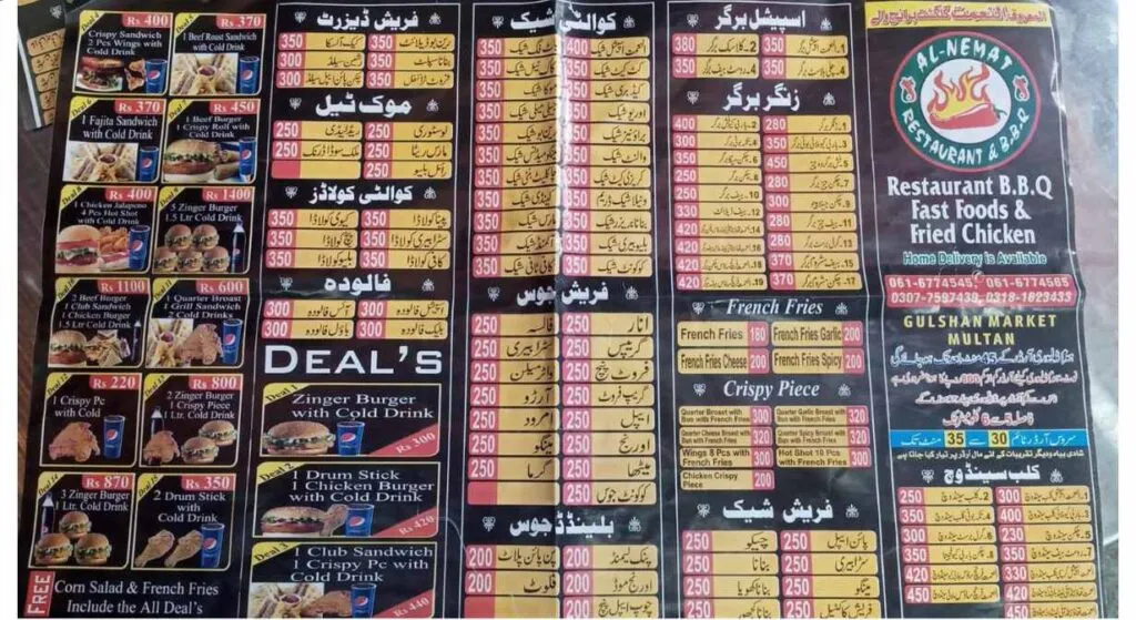 Al Nemat Restaurant and BBQ offers a comprehensive menu that combines traditional Pakistani flavors with fast food and Chinese cuisine, making it suitable for families, large gatherings, and casual dining. From BBQ platters, karahi, handi, and biryani to burgers, broast, fries, shakes, juices, and value deals, the restaurant provides a wide variety of options at competitive prices. With extended late-night hours and convenient branch locations in Multan, it remains a reliable dine-in destination for customers seeking both desi and continental-style meals under one roof.