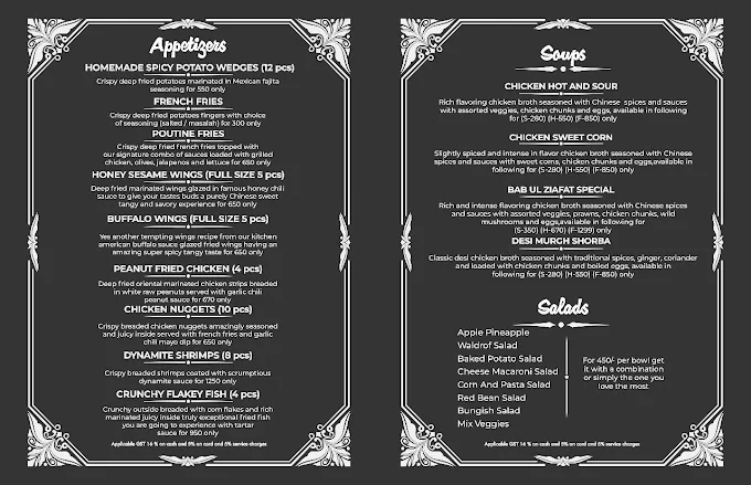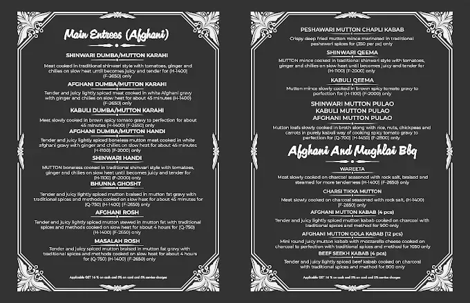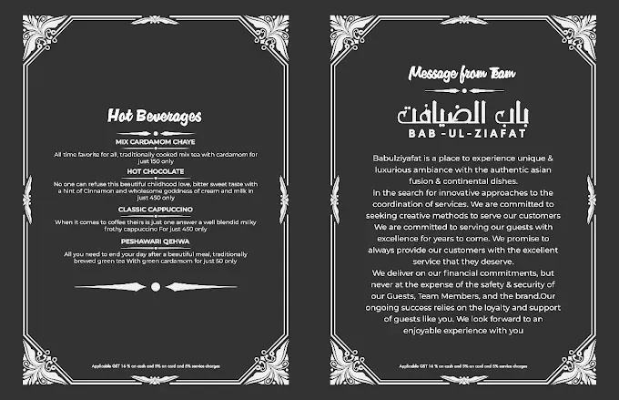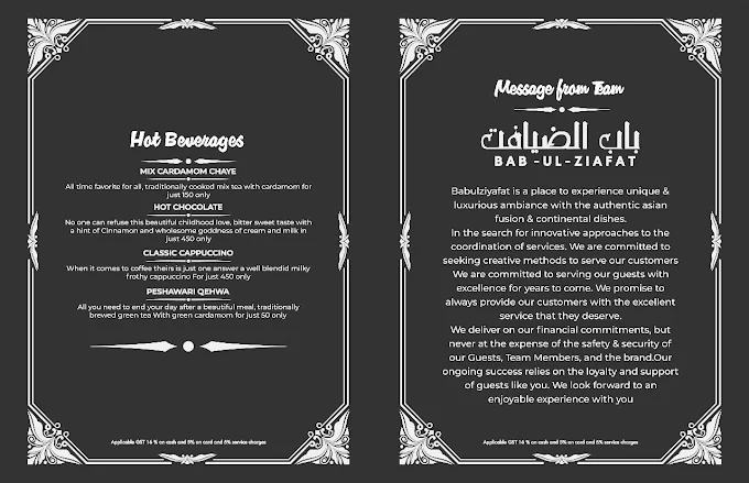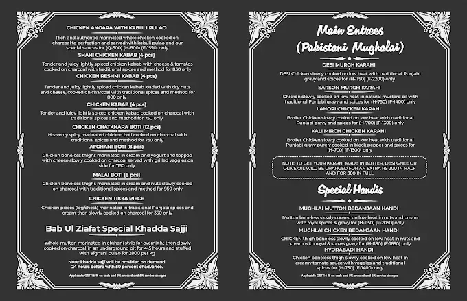 Babul Ziyafat Restaurant in Multan delivers an extensive menu covering Pakistani Mughlai classics, Afghani specialties, BBQ, Pan-Asian cuisine, tandoor breads, desserts, and beverages. With family-friendly portions, premium dishes like Khadda Sajji, Shinwari Karahi, and specialty Handis, along with modern appetizers and shakes, it offers something for every taste preference. Operating from 12 pm to 12:30 am, it is a convenient choice for lunch, dinner, and special gatherings in Multan.