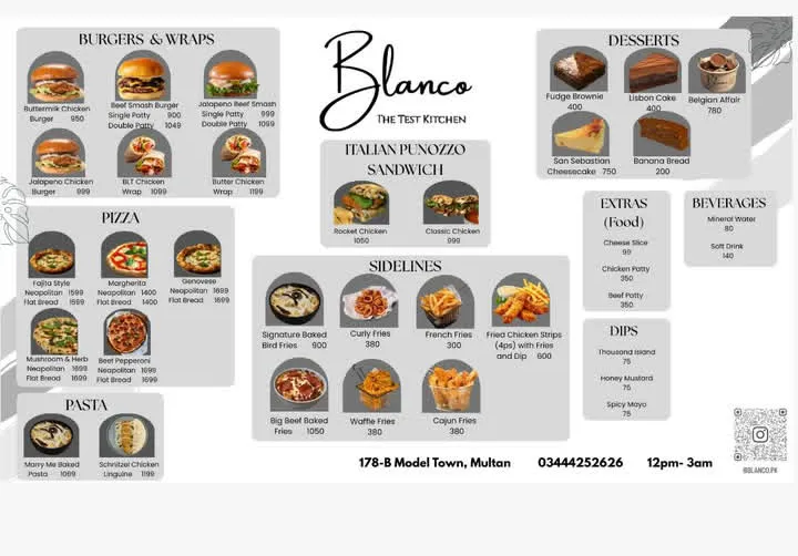 Blanco The Test Kitchen is a modern café and contemporary dining spot located in Block B, Model Town, Multan. Known for its gourmet burgers, Neapolitan pizzas, Italian sandwiches, premium coffee, Japanese matcha drinks, and creative beverages, Blanco offers a unique food experience in a stylish setting.