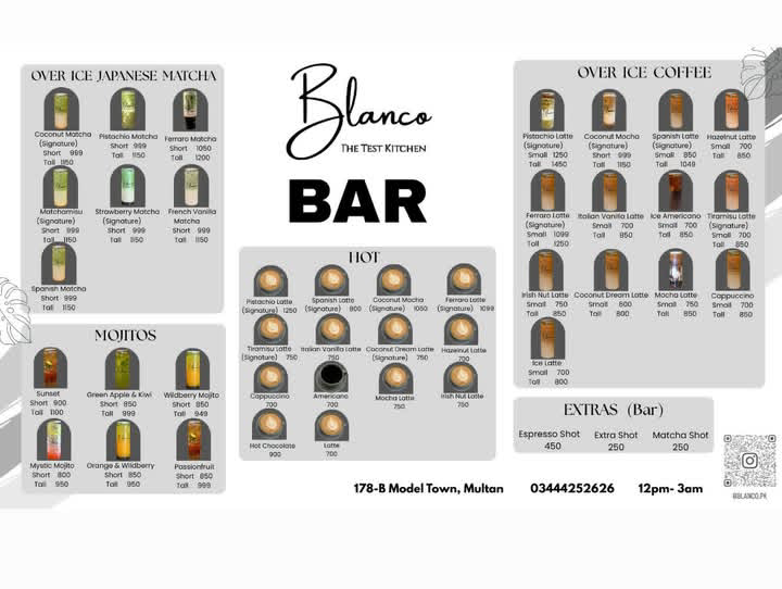 Blanco The Test Kitchen in Model Town, Multan offers a diverse and modern menu including gourmet burgers, wraps, Neapolitan pizzas, flat breads, pasta, Italian sandwiches, desserts, Japanese matcha drinks, mojitos, hot beverages, iced coffees, and signature specialty drinks. With late-night service till 3 AM, it is a suitable spot for casual dining, coffee meetups, and group hangouts. The menu features both classic and signature items, giving customers a wide range of options throughout the day and night.