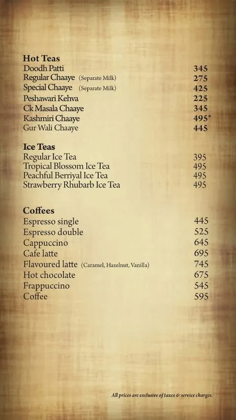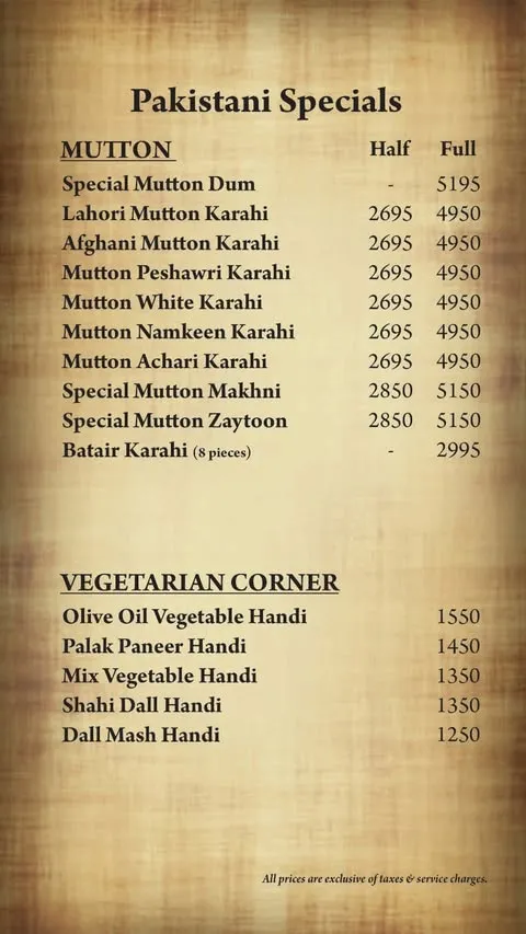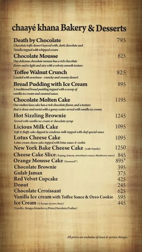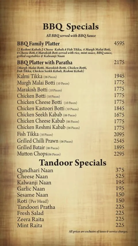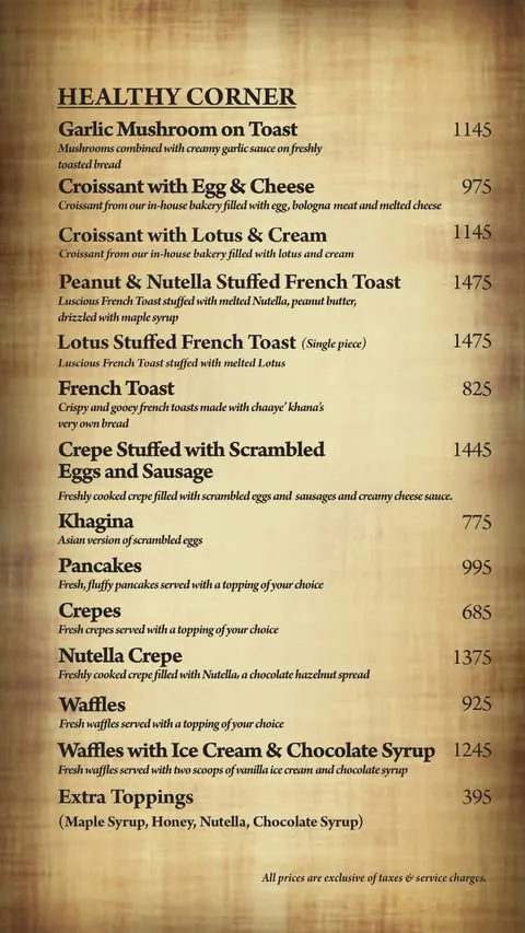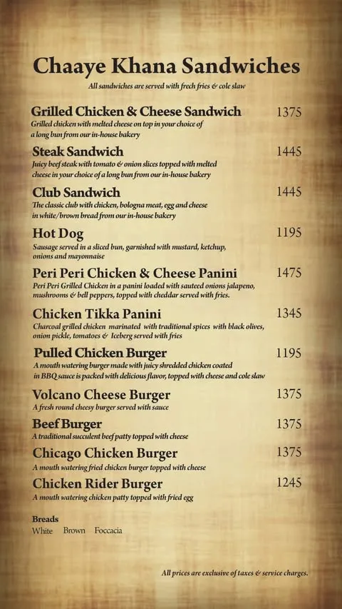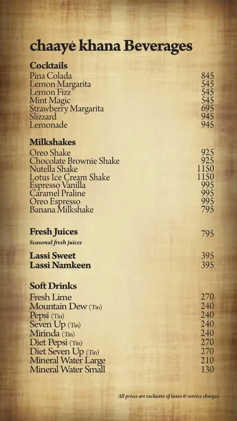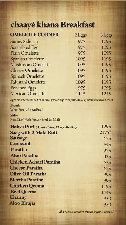 Operating daily from 8:00 AM to 12:00 AM, Chaaye Khana is especially popular for its omelette corner, healthy breakfast items, steaks, pasta, karahi dishes, and signature tea selections.